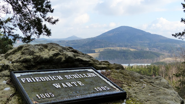 Von Süden steigen wir auf den Grünberg, zunächst mit dem Ziel Schillerwarte. Von der Aussichtsplattform, die anlässlich Schillers 100. Todestages eingeweiht wurde, bietet sich einer der schönen Ausblicke auf die oben geschilderte Landschaft zwischen Mergthal und Glasert. Nun weiter hinauf zum vollständig bewaldeten Gipfel des Grünbergs. Nur die zu dieser Jahreszeit kahlen Bäume erlauben einen lockeren Durchblick zum Kleis (Klíč). Ein Aussichtsturm würde sich hier ausgesprochen gut bewähren, aber wie uns Dr. Hantschel berichtet: