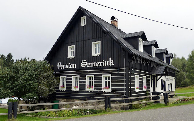 Weiter wandern wir nach Friedrichswald (Bedřichov), „reizend im Thale zwischen Weberberg und Königshöhe wie ein Alpendorf gelegen“ (Franz Hübler), welches durch die Verwandlung in einen Wintersportort seinen Charme als das gewesene hübsche Gebirgsdorf längst eingebüßt hat. Über den Skihang geht es hinauf zum Weberberg, auch als Himbeerberg (Malinový vrch) bekannt. Mit einem kurzen Abstecher zur Weberbaude auf seinem Gipfel möchten wir uns nach dem Zustand derselben erkundigen, in der wir gerne nach der Wende, als die Grenze aufging, einkehrten. Fehlanzeige. Die Baude ist bestens vorgerichtet, aber der Zutritt scheint nur für Hausgäste gestattet zu sein. Ein martialisches Tor öffnet sich per Fernbedienung, wenn man im Besitz einer solchen ist. Abgehakt, es gibt Alternativen, wie wir gesehen haben.
