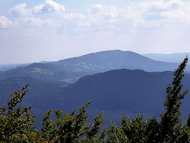 Tölzberg (Tlustec, 591 Meter), Audishorner Spitzberg (Utechovicky Spicak, 499 Meter) und Mazova horka, 569 Meter