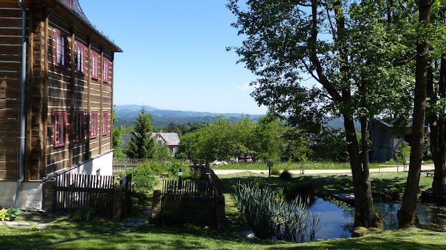 Die Terrassenseite der Baude. Leider schränken die Bäume die Sicht stark ein.