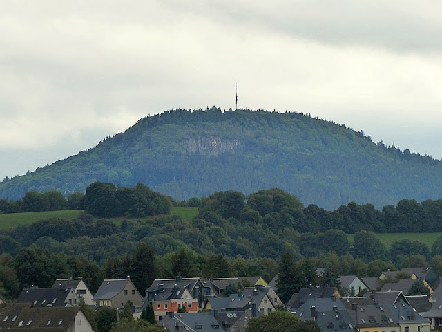 Im Süden:  Der Bärenstein (898 Meter), Keilberg (Klinovec, 1244 Meter) und Fichtelberg (1215 Meter) werden leider von Wolken verdeckt.