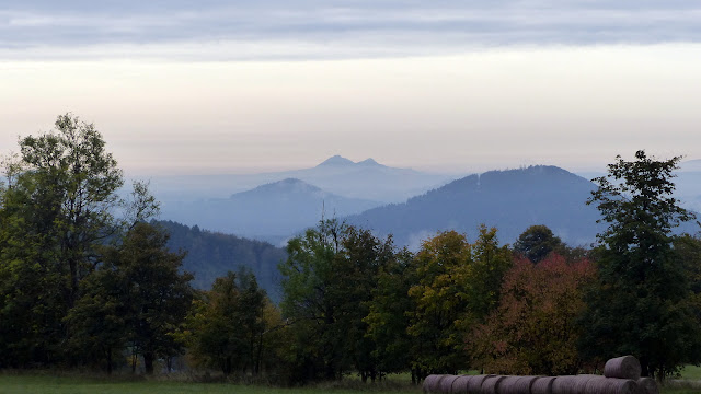 Wir starten früh bei noch ziemlich nebligem Wetter an der Chata Luž in Jägerdörfel (Myslivny). Unterhalb der Baude entfaltet sich trotzdem bereits ein zauberhaftes Gebirgspanorama. Der Roll (Ralsko) und die Bösige (Bezdězy) erheben sich am Horizont aus dem Dunst. Kurz nachdem wir in den Wald eintreten, sehen wir am Wegrand einen liegen gelassenen Haufen Müll. Hat man das heute nötig, seinen Unrat im Wald zu entsorgen, fragt man sich. Bei näherem Hinsehen stellen wir fest, dass es sich dabei um ein Knäuel unlängst benutzter Schlafsäcke handelt, die achtlos liegen gelassen wurden. Man kann sich unschwer einen Reim darauf machen: die Schläfer werden sie nicht mehr benötigen, denn sie haben sich vermutlich einen Kilometer weiter von der deutschen Polizei aufgreifen lassen. Wer räumt nun die Schlafsäcke weg?