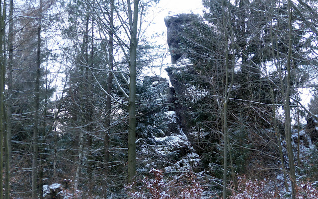 Weiß man, ob diese kleine grenzüberschreitende Wanderung nun die letzte gemeinsame Unternehmung des Jahres 2021 ist? Offiziell sind wir eigentlich in Winterruhe, aber wenn das Wetter so verlockend ist, nutzen wir natürlich die Gelegenheit.. Von Jonsdorf wandern wir zunächst über den angenehm zu begehenden Vater-Imme-Weg an der Südflanke des Buchberges in Richtung Wache Waltersdorf. Linker Hand passieren wir dabei das grazile, leicht verschneite Felsmassiv der Ottersteine. Ein Stück des Weges weiter steht oberhalb rechter Hand noch der Dachsstein im Walde. Gerne würde man zu diesen Felsen ein paar Informationen aus der Literatur erfahren, aber mir fallen keine Fundstellen dazu ein, sogar die ansonsten so auskunftsfreudigen Seiten luzicke-hory.cz hüllen sich zum Thema Buchberg in Schweigen. Und das, obwohl dies der höchste Berg Europas ist. Aber darüber haben wir ja im letzten Jahr bereits berichtet