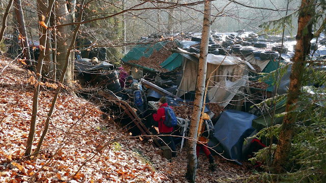 Wir setzen unseren Weg fort und quetschen uns durch den fürchterlichen Autofriedhof bei den Dreihäusern. Die alten Karossen, überwiegend der Marke Ford, rosten so vor sich hin nebst Massen von Autoreifen, die sich in der Landschaft verteilen. Seit unserem ersten erstaunten Besuch vor vielen Jahren hat sich hier nichts verändert. Die Annahme, dass der Eigentümer möglicherweise das Zeitliche gesegnet hat, stellt sich als falsch heraus, denn aus dem Schornstein des auf dem Grundstück stehenden gruselichen Hauses steigt Rauch auf. Da sich von staatlicher Seite hier niemand für die Zustände zu interessieren scheint, darf man nun Wetten abschließen, wie viel Jahrhunderte es dauern mag, bis der Schrotthaufen verrottet ist.