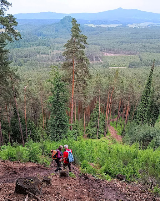 Über diese sogenannte Heidenstiege, die fast senkrecht durch den Felskragen führt, kraxeln wir auf das Sandsteinplateau hinauf. Die Hochfläche bietet einige Felsvorsprünge, von denen man die umliegende Bergwelt betrachten kann. So sieht man den Hammerspitzberg und den Dewin einmal aus ungewohnter Perspektive. Die Bäume auf diesem Plateau haben genauso gelitten, wie wir das von anderen Waldpartien kennen, allerdings greift hier der Mensch nicht ein. Wie soll er mit seiner Technik hier herauf kommen? Mir geht indes etwas anderes durch den Kopf, nämlich, wie man von diesem Breiten Stein wieder herunter kommt. Wie sich herausstellt, muss man dazu nicht durch die Felsen klettern, vielmehr geht es über fluffigen Untergrund steil talwärts, kaum dass die Füße Halt finden. Der eine (ich) oder andere setzt sich auf den Hosenboden und lässt den Dingen freien Lauf. Am Ende sind alle gesund unten angekommen. Auf dem Weg zurück begegnet uns noch der imposante Dohlenstein (Kavčí skála), ein geschätzter Kletterfelsen Rudolf Kauschkas.