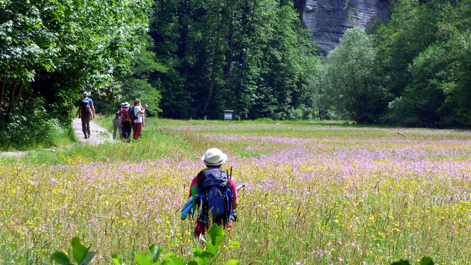 Genau dieser Wegbeschreibung folgen wir, wobei wir die historischen Betrachtungen des Herrn Kirsch ausblenden wollen, sie sind ohnehin alsbald wieder vergessen, während die malerische Umgebung der Burg Kost mit ihren herrlichen Felsentälern und Teichen eine bleibende Erinnerung hinterlässt. Am Oborsky-Teich verzweigt das breite Tal in das Kleine Plakanek Tal, das sanft ansteigend hinauf zu dem Denkmalort Vesec führt. In diesem Tal nun treten die Felsen enger aneinander. Zur Zeit blüht hier wie wild der Hahnenfuß.